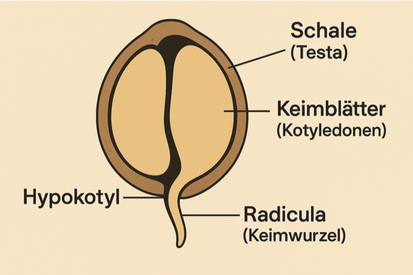 Germination is triggered by moisture (activates enzymes), warmth (ideally 23°C–25°C), and oxygen. The radicle breaks through the seed coat first and becomes the main root. Shortly afterwards, the cotyledons emerge and nourish the seedling until photosynthesis begins.