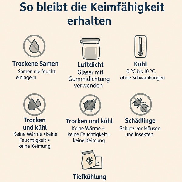 Feuchtigkeit in Kombination mit Wärme führt dazu, dass Samen ihre Keimruhe verlieren und Schimmel oder Bakterien entstehen. Saatgutbehälter sollten daher in trockener Umgebung stehen – ein kühler Keller eignet sich besser als eine feuchte Gartenhütte. Bei sehr hoher Luftfeuchtigkeit können Silikagel-Beutel oder Reis zur Feuchtigkeitsregulierung beitragen.