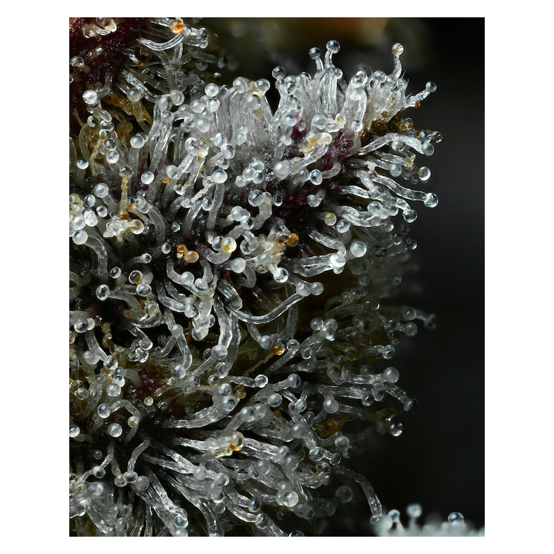 Einer der auffälligsten Aspekte der Sorte Lemon Cherry Gelato ist ihr visueller Reiz. Die Blütenstände sind ein Kaleidoskop aus Farben, die von kräftigem Purpur über leuchtendes Grün bis hin zu tiefem Orange reichen und alle mit einer frostigen Schicht aus Trichomen bedeckt sind. Diese schillernde Erscheinung ist nicht nur eine Augenweide, sondern deutet auch auf das komplexe Geschmacksprofil hin, das einen erwartet.