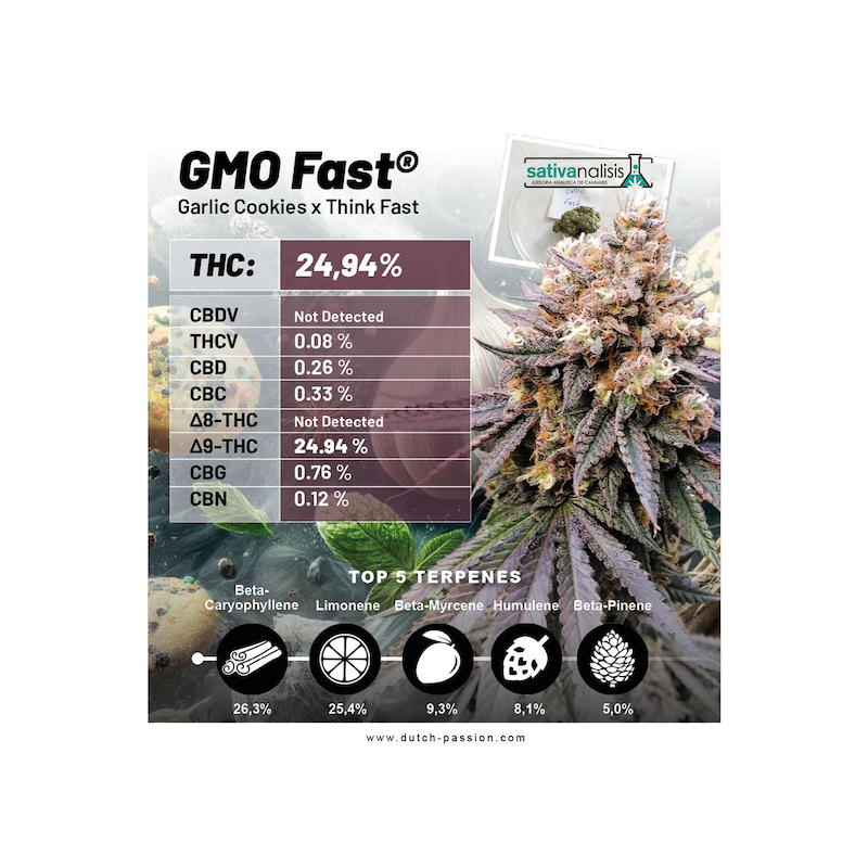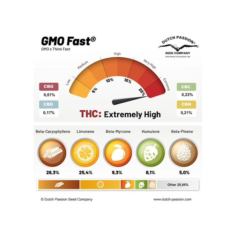 Das Ergebnis ist eine schnelle, stabile und sehr potente photoperiodische Cannabissamensorte mit einem völlig bahnbrechenden Terpenprofil. Die meisten GMO Fast-Pflanzen haben das unverwechselbare und einzigartige herzhafte Zwiebel-Knoblauch-Aromaprofil. Der THC-Gehalt dieser feminisierten Cannabissamensorte ist sehr hoch und liegt normalerweise bei etwa 20 % oder knapp darüber.