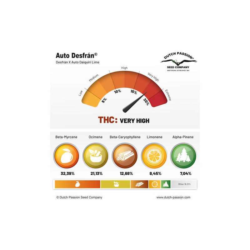 Die Genetiker von Dutch Passion haben dafür gesorgt, dass die begehrtesten Eigenschaften, wie ein sehr energiegeladenes und klares Up-High, erhalten bleiben. Auto Desfrán hat auch ein sehr günstiges Blüte-zu-Blatt-Verhältnis.