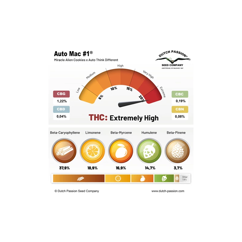 Unter normalen Bedingungen liegt der THC-Anteil im Durchschnitt bei etwa 20 %, aber wenn du die perfekten Bedingungen schaffst, kann dieser leicht auf etwa 22–25 % steigen. Unser Auto MAC #1 ist die Autoflower-Version der bekannten und preisgekrönten amerikanischen MAC-Genetik und ist definitiv einen Versuch wert, wenn du kompakte, weiße Cannabisblüten von höchster Qualität magst!