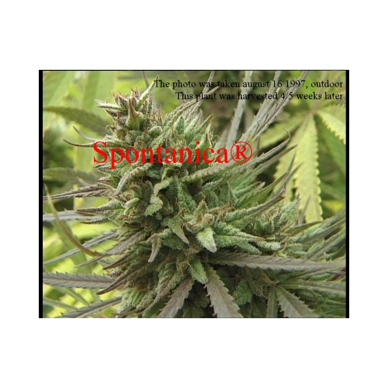 Dieser Cannabissamen ist eine stabile Kreuzung zwischen einem geheimen Projekt Nr. 1 und einem K.C.33®, das von Indica-Genen dominiert wird. Ihr Verhalten unterscheidet sich nicht viel von anderen Indicas - ein SPONTANICA®-Samen produziert buschige Pflanzen mit dunkelgrünen Blättern, die ihren dünnen, kräftigen Stiel schön kleiden. Das Verhältnis von Blatt zu Blatt ist so ausgewogen, dass beide genügend Platz und Licht haben, um sich vollständig zu entwickeln. Was SPONTANICA® von anderen Marihuanasorten unterscheidet, ist ihre Fähigkeit, extrem große Pflanzen zu produzieren. einige im Freien können bis zu 4,5 m hoch werden. Kein Wunder, dass wir bei solch einer großen Höhe einen hohen Ertrag erwarten können. Und sie enttäuscht uns nicht - der Ertrag draußen ist erstaunlich hoch und macht so viel wie 900 Gr. pro Pflanze! Indoor-Sorten behalten ihre Indica-Eigenschaften und bleiben so kurz wie nur 150 cm, immer noch mit einer ruhigen Ausbeute - 150 g. pro Pflanze. Es dauert nur 8-10 Wochen für Blumen, um innen zu reifen. Die Outdoor-Zeit ist Ende September bis Mitte Oktober. Obwohl SPONTANICA® Marihuana für den Anbau im Freien gezüchtet wurde, zeigt sie ausgezeichnete Treibhaus- und Indoor-Eigenschaften. Ihre Cannabissamen sind schimmelresistent. Dieser Stamm gilt als einer der stärksten Stämme und dennoch am einfachsten zu klonen. Die Knospen sind groß und bilden kompakte glänzende und klebrige Einstellungen auf ihren Zweigen; manchmal ist es empfehlenswert, sie wegen der Schwere dieser hocharomatischen Knospen festzuklammern. Schon am Ende der Blüte beginnen sie, einen weichen und süßen Geschmack zu verbreiten und bis zum Ende weiterzuführen. THC soll zwischen 18 und 20% liegen. SPONTANICA® gibt Ihnen eine sehr glatte, aber starke Wirkung.