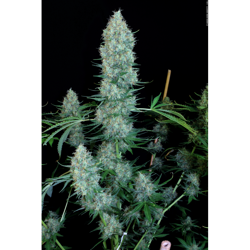 Die Pflanze bleibt kurz und buschig, was sie ideal für Indoor- und Schrank-Grows mit begrenzter Höhe macht. Besonders auffällig ist ihre üppige Harzproduktion: Bereits während der Blüte sind Blüten und Zuckerblätter von einer dicken, glänzenden Trichomschicht überzogen – das spart Arbeit beim Maniküren und sorgt für extrem klebrige Ernten.