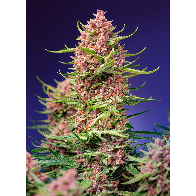 Lichtabhängige feminisierte Sorte mit extrem schneller Blütenbildung und roten Blüten. Erste Filialgeneration (F1) aus der Kreuzung eines ausgewählten lichtabhängigen Eliteklons der berühmten kalifornischen Sorte Sunset Sherbet und einem ausgewählten selbstblühenden Stamm von Strawberry Cola Auto.