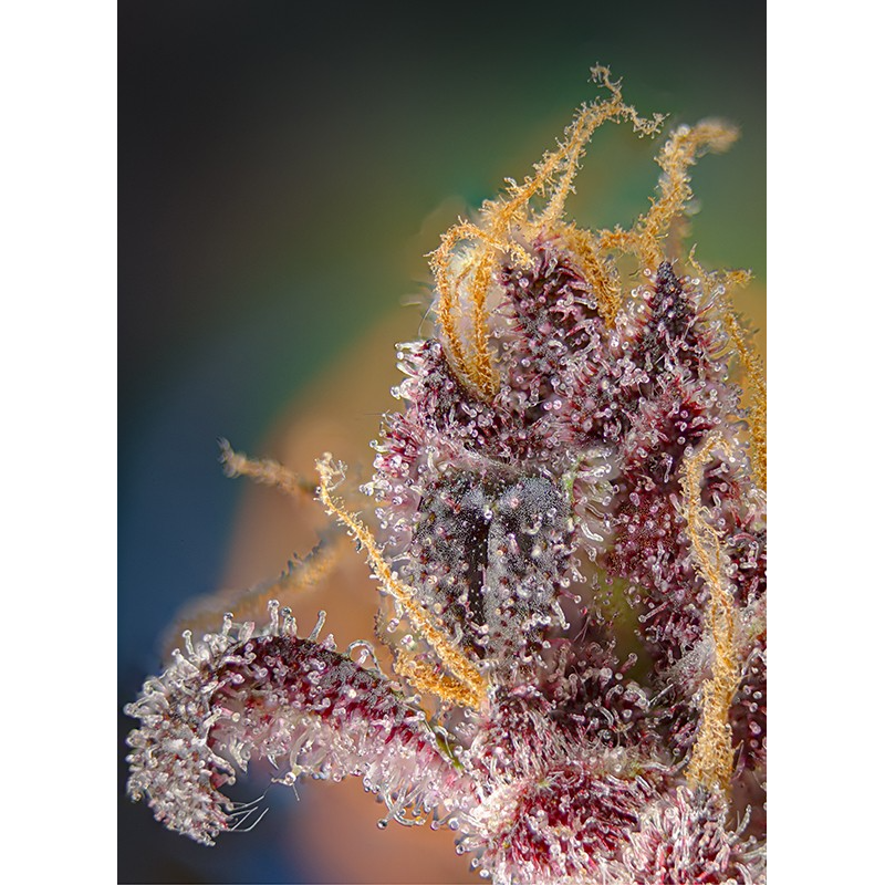 Die Sorte hat einen kräftigen Hybrid-Charakter und bildet lange Seitenzweige mit dicken, kompakten Knospen, die voller aromatischem Harz sind. Die Knospen färben sich in der Blütezeit dunkelviolett und verströmen ein dichtes, starkes, süßsaures Aroma mit frischen Noten von Zitronen und Mandarinen sowie einem säuerlichen Unterton von roten Beeren.