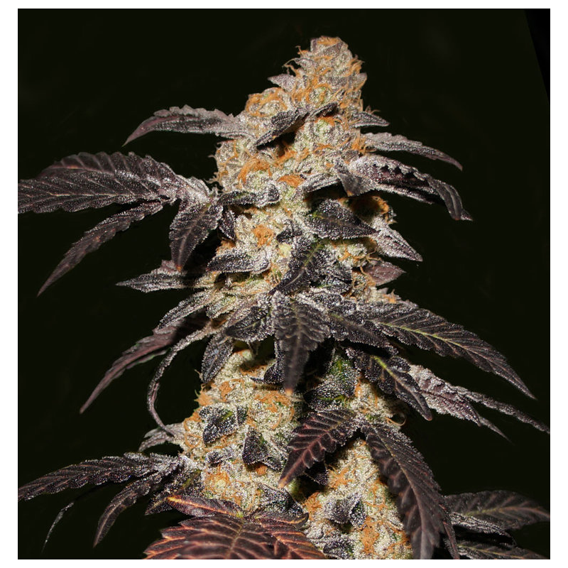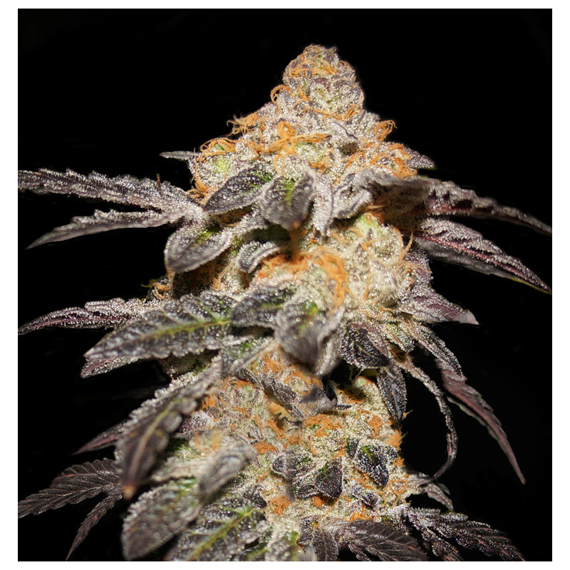 In der Wachstumsphase zeigt die Pflanze ein spektakuläres Farbspiel – von dunklem Grün über Violett bis hin zu fast schwarzem Laub. Die Buds sind dicht, harzig und strotzen vor weißen Trichomen und orangefarbenen Härchen. Während der Blüte entwickelt sich ein klassisches Cookies-Aroma mit subtilen Traubennoten – süß, verführerisch und absolut einzigartig.