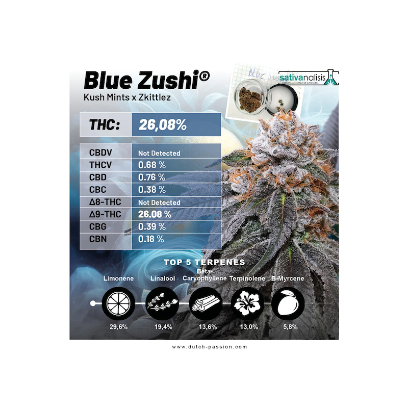 Dutch Passion Blue Zushi (Kush Mints x Zkittlez) is a unique hybrid cannabis strain with an indica dominance, known for its potent, pungent flowers. This is a very strong strain from the USA with a THC content that can easily exceed 25%.