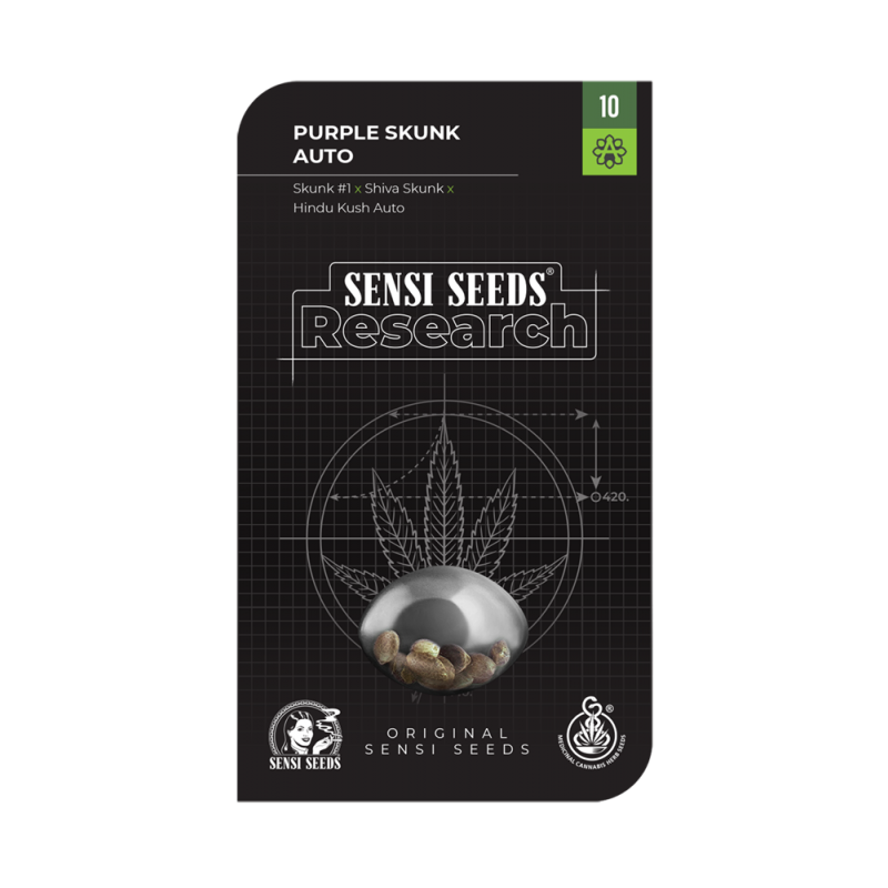 Les graines de Purple Skunk à Autofloraison sont 75% indica et 25% sativa. Cette variété a été élaborée dans le cadre du projet 2021 de Sensi Seeds Research à partir de trois parents notoires: Hindu Kush à Autofloraison, Skunk #1 et Shiva Skunk. En vertu de son bagage génétique, elle dégage un arôme et une saveur de moufette et procure un stone classique d’indica.